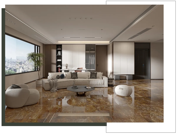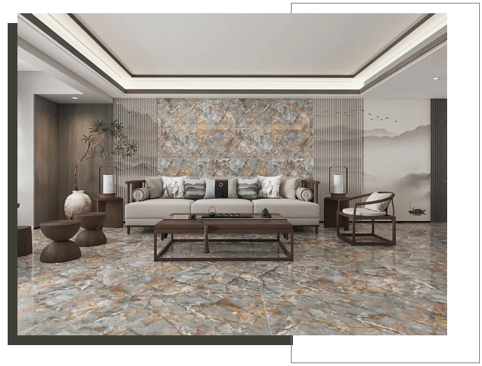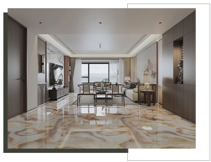 【玛吉特】整体大面积上墙铺地,打造出大气磅礴的视觉张力,搭配新中式风格的家居软装,将高级与优雅平衡融入,尽显居者不俗
