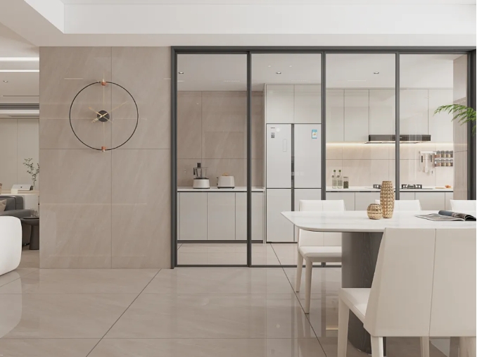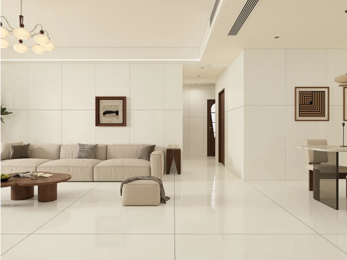 98度水晶釉面质感,光晕在砖面流转时如同薄雾漫过绸缎,让空间在虚实明暗的对话中,舒展成通透的视觉容器。